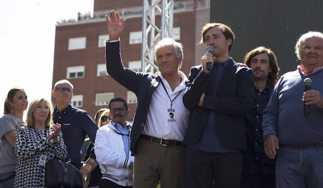 Gelete Nieto, visiblemente emocionado y con lágrimas en los ojos, saluda a la multitud y les agradece el que hayan venido al homenaje de su padre, mientras su hermano Pablo Nieto hace lo propio al tiempo que es entrevistado sobre el escenario.
