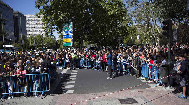 12:25 h: Hay ya aproximadamente 120.000 personas que literalmente inundan tanto los aledaños norte, sur, este y oeste del Estadio Santiago Bernabéu como ambas aceras entre la torre BBVA de Castellana, 81 y la zona de parking del estadio.