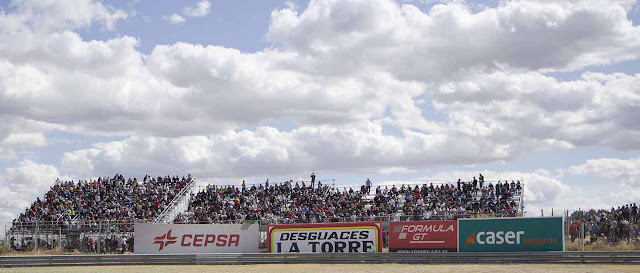 Más y más gente sigue llegando al Circuito del Jarama y el volumen de público es tremendo. Tanto las diferentes gradas próximas a la Curva Ángel Nieto y la estatua con su casco y guantes como las zonas de suelo adyacentes a la pista están totalmente repletas de personas.