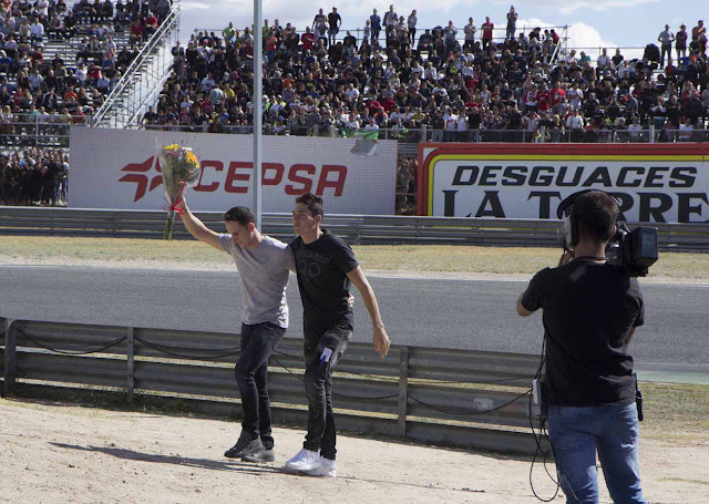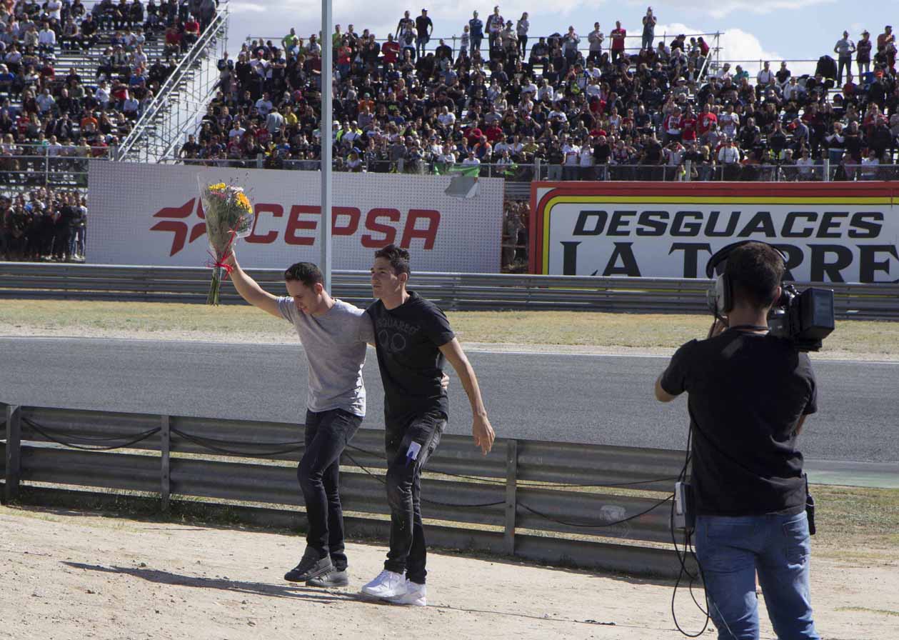 Albert Arenas (piloto del equipo Aspar Mahindra de Moto3 y subcampeón del mundo junior FIM CEV de Moto3 en 2015) y Jorge Martín (piloto del Conca Gresini Racing de Moto3, que ha conseguido hasta la fecha 7 podios, 6 poles y 2 vueltas rápidas) saludan a los espectadores mientras caminan hacia la estatua con el casco y guantes de Ángel Nieto,