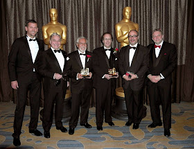 Iain Neil (izquierda) y André de Winter (derecha) con sus respectivas placas como ganadores del Premio Científico y de Ingeniería de la Academia de Hollywood.