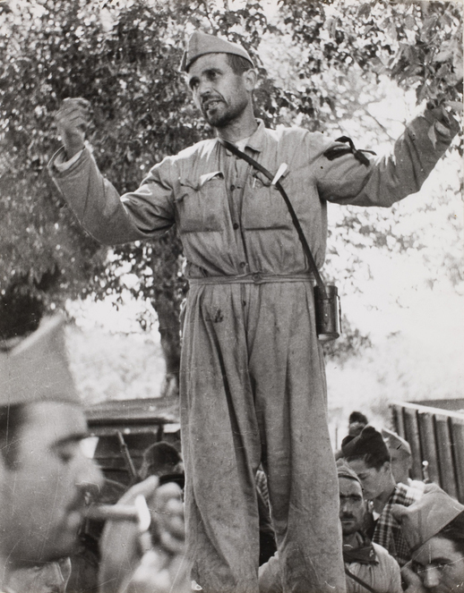 Capa percibe la enorme intensidad emocional de este jefe miliciano mientras intenta infundir valor a los muchos combatientes civiles alcoyanos y andaluces que le escuchan.