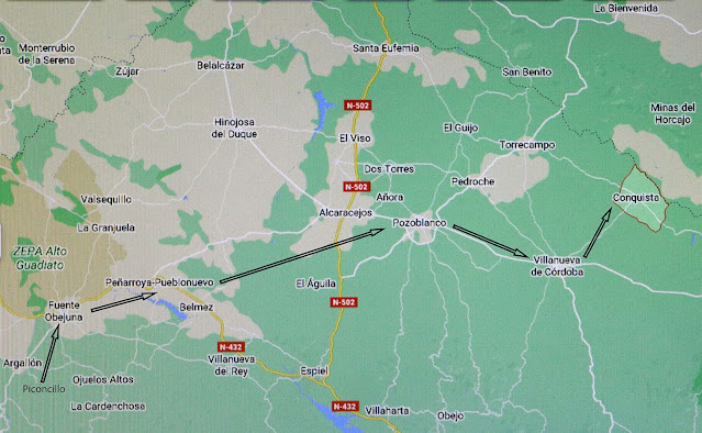Pero una vez allí, mi madre y mi hermano no pudieron regresar a la zona de Piconcillo ni a Fuenteobejuna ni a la casilla de mi tía, porque Peñarroya-Pueblo Nuevo se había convertido en línea de frente, con constantes bombardeos de artillería y aviación, así que mi madre y mi hermano José María tuvieron que ir andando 90 km a Conquista, cerca de la frontera con la provincia de Ciudad Real, donde vivía otra de las hermanas de mi madre.