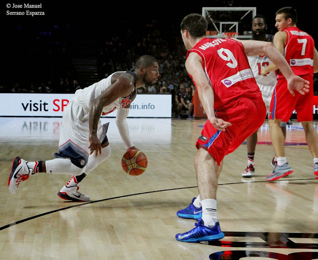 After five minutes of the first quarter, Serbia is ahead by eight points. The United States coach Mike Krzyzewski realizes that Serbia is momentarily controlling the tempo of the match and the American team can´t find its pace. It´s necessary to specially stop Milos Teodosic (the great Serbian plamaker, who is being highly effective with both his penetrations and medium and long distance shots, and at the same time is making possible through his assists to his best situated teammates that the Serbian squad do very good jumpers selections), Bogdan Bogdanovic (the best elite Serbian sniper who is being a constant threat thanks to his amazing accuracy in long distance shots and his remarkable leaping ability enabling him to attack the hoop with great power, facing the rival guards, power guards and forwards) and Nemanja Bjelica (a forward whose great height - 2.09 m-, stunning mobility for his size and versatility, getting the most of his excellent individual technique, make that Sasha Djorgevic uses him him as a 3, 4 and even 2 depending on the match circumstances, which is begetting some confusion in the United States defense.