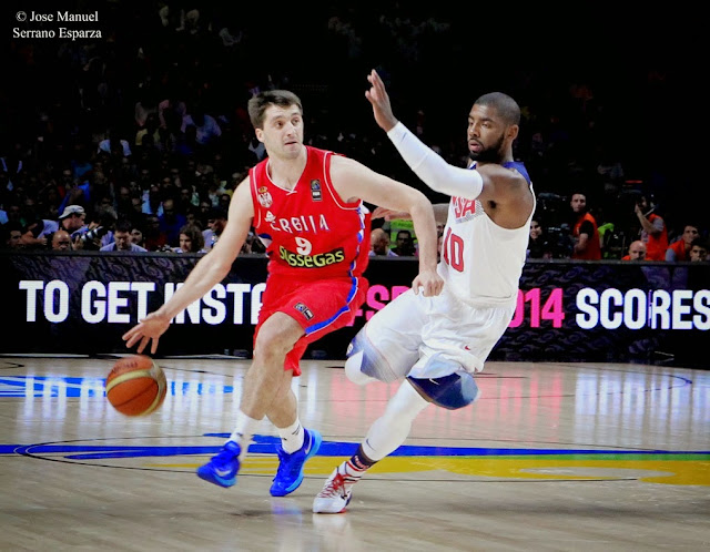 Milos Teodosic. The great Serbian shooting guard, one of the best European players in his post, offered an exhibition of top basketball during the first quarter, with masterly control of the game timing, remarkable distribution of the play, creativity in attack and excellent medium and long range shooting. His attitude deserves high accolades, since he had to defend Kyrie Irving (the reference-class NBA guard in terms of penetration speed, changes of pace and brutal decelerations), an exceedingly difficult to defend one on one man and boasting a far superior physical ability than him, in spite of which the Serbian captain, fought to the end plucking up courage and using all of his stamina. Albeit his performance was decreasing from the second quarter because of the progressive tiredness and the physical superiority of the United States team (whose men are able to play the four quarters with the same intensity), Teodosic went on battling tooth and nail until the end of the game, keeping a fairly good attacking level and wisely conducting his teammates. Even being already apparently beat, he was able to do a great play at 04:26 from the end of the fourth quarter, when being simultaneously tightly defended by Stephen Curry near the United States 6,25 line and the U.S center Andre Drummond hindering a possible penetration through the right side, he sent an alley-hoop pass to Nikola Kalinic, who surpassed DeMar DeRozan´s defense and scored two points with a slam dunk in United States basket.