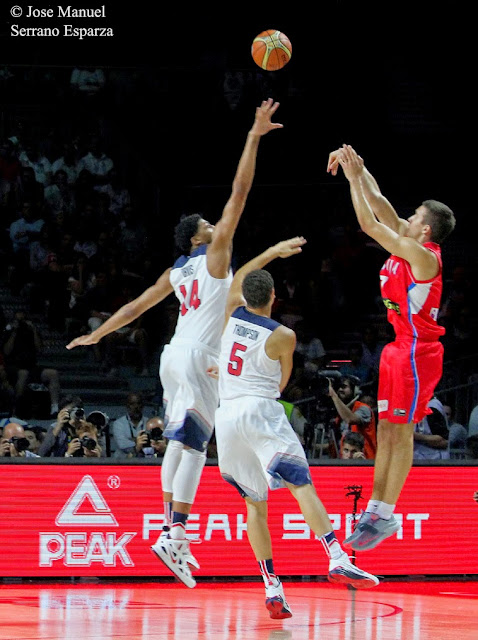 Serbia fought as much as he could against the United States squad, a juggernaut of defensive and offensive baskeball, trying to reduce distances by means of 3 pointers. Here we see Bogdan Bogdanovic - who has just received a pass from Stefan Markovic, with Derrick Rose next to him- nailing one after a good shooting selection of the Serbian team, which prevents DeMarcus Cousins arriving in time to block or touch the shot, on obliging him to watch the possible assist trajectory to Krstic (visible on the right) who advances towards the American basket. DeMarcus Cousins´s attitude and unselfish sacrifice for his team was extraordinary, and besides, at the end of this second quarter he made a sensational defensive play, stealing the ball from Bjelica in perimeter area with a vary fast movement of his right hand and forcing the personal fould of the Serbian forward on trying to recover the ball.