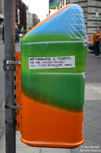Berlin (Germany). July 9, 2006 at midday. Two desperate football enthusiasts have stuck a makeshift paper advertisement to a street waste paper bin, asking for tickets for the Final Match Italy vs France slated to begin at 20:00 h in the Berlin Olympiastadion.