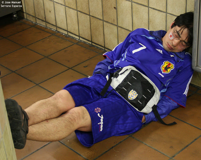 A further Japanese fan clad in the Japanese national football shirt is slept like a log, after having managed to lie on the ground in a rather narrow space, with his head leaned on the back wall and his feet resting on the front one.