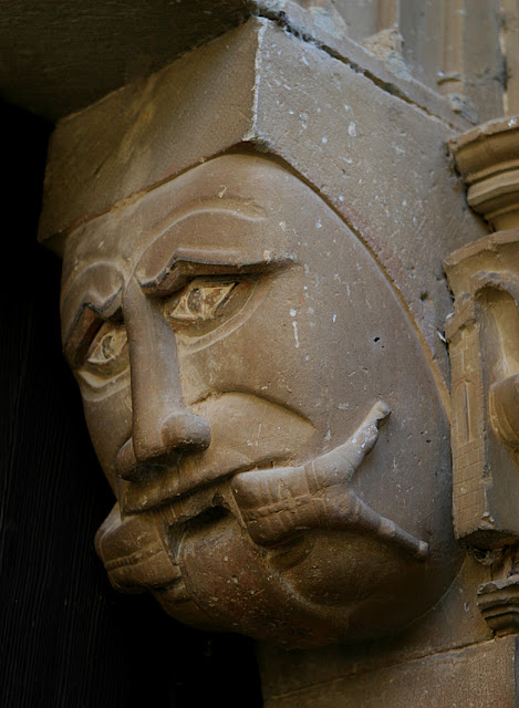 the sculpted in high relief head of a medieval man with long hair, beard and moustache at the same height of