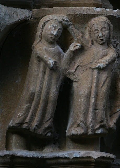 Furthermore, we can see the prowess of the Gothic sculptor to convey different moods to the persons countenances with not very complex profiles and facial traits, something much more difficult than one could think, specially in the third one from left, whose face apparently reveals fear, in the same way as happens with the terrified countenance of the head of a man inside a dish located between the seventh and eighth archivolte of the gorgeous portal of San Zoilo hermitage, above the tympanum.