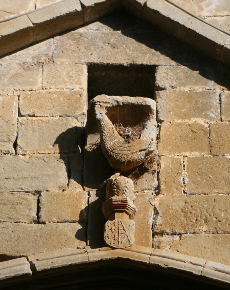 the cock and coat of arms of d´ Évreux dynasty, as a homage to Marie d´Evreux ( 1303-1335, member of the French House of Capet and eldest child of Louis d´Évreux and his wife Margaret of Artois), whose younger siblings were Charles d´Évreaux, Philip III of Navarre (who married Joan II of Navarre, founding the Navarrese branch of Évreux House, which provided a significant economical back for the construction of San Zoilo Hermitage) and Jeanne d´Évreux (Queen of France through her marriage to Charles IV of France), whereas just under its left lower end there is