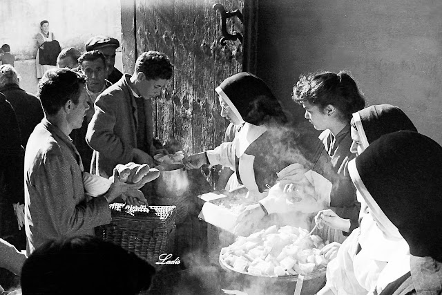 This picture was made with the heart and the soul by a man from head to toe who, though lacking a leg, always managed to reach everywhere at the suitable moment and place himself in the best possible position to get his pictures, something of extreme difficulty for a one-legged disabled man, and which had to undoubtedly mean for this great photojournalist to make a huge level of constant effort, often on the brink of exhaustion, during his entire career as a photographer, because the classic social photojournalism using primes (particularly with 50 mm lenses, which because of their short tele nature are more complex to use than the 35 mm — photojournalistic lens par excellence — and 28 mm wideangles) requires constant and fast movements with both feet to be able to do the framings, so it can be inferred that the courage, amour propre, level of self-commitment and professionalism of this man who passed away in 1988 had to be truly impressive, in the same way as this picture taken by him and containing another fundamental ingredient: the very strong Andalusia sun which penetrates diagonally into the image from the upper left corner, bathing the whole scene in light and specially striking the faces and thoracic area of the three nuns and the auxiliary young woman who are feeding the unemployed Cordovans, along with the large pot inside which potatoes are being baked and the cardboard box containing the breads, both of these elements making up the extreme high key of the picture along with the bosom of the nearest nun to the camera.