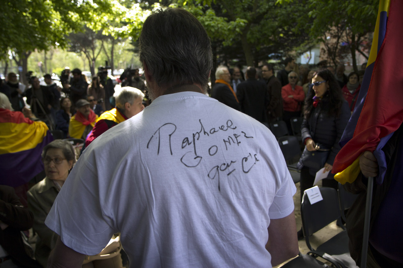 One of them, appearing backwards in the foreground, has written on the back of his T-shirt the name Rafael Gómez 9th Company, referring to the last alive Spanish Republican combat of La Nueve, whose presence in the act has been announced for some days.
